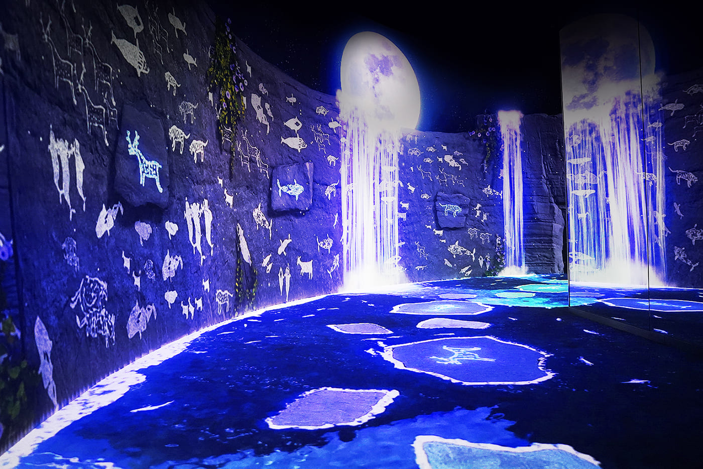 울산 반구대 암각화에서 영감을 받은 인터랙션 미디어 아트 공간은 관람객들의 걸음에 따라 펼쳐지는 특별한 경험을 선사합니다. 이 공간은 울산의 고대에서 현재로 이어지는 정신과 역사를 상징합니다. 벽면과 바닥에 구현된 인터랙션 미디어 아트는 관람객이 돌을 밟을 때마다 환상적인 파티클이 퍼지고, 수면 위에서 도망치는 물고기들이 표현됩니다. 또한, 관람객이 암각화 패턴이 새겨진 돌을 밝히면, 울산의 과거에 존재했던 혹등고래, 대륙사슴, 호랑이와의 만남을 경험할 수 있습니다.